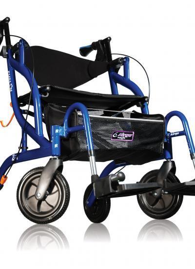 The Airgo Fusion is a lightweight rollator which easily converts to a transport chair. Side folding with a padded seat and full backrest for superior comfort. Suitable for indoor and outdoor use.