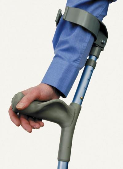 Ergonomic shaped anatomical handgrip forearm crutch designed to distribute pressure more evenly across the hand.